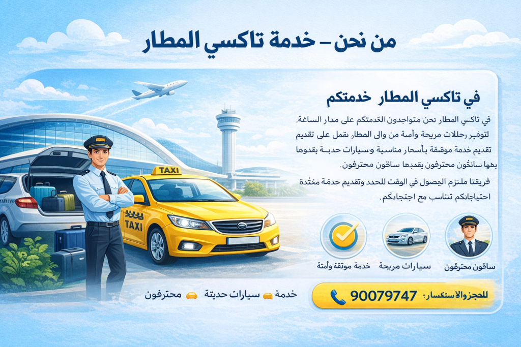 نحن في تاكسي المطار نقدم خدمة نقل موثوقة واحترافية من وإلى المطار على مدار الساعة، مع التزام كامل بالراحة، الأمان، والدقة في المواعيد. تأسست خدمتنا لتكون الحل الأمثل للمسافرين الباحثين عن وسيلة نقل سهلة، سريعة، وخالية من القلق.